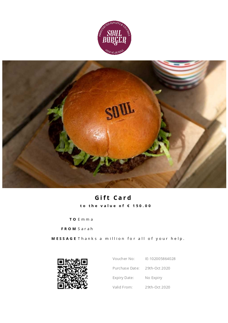 Soulburger Ltd allows you to purchase instantly printable gift vouchers, special offers and tickets using the Voucher Connect platform.